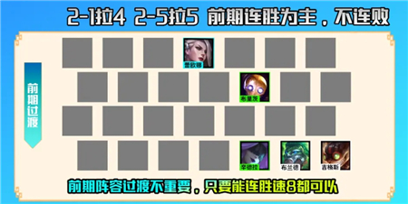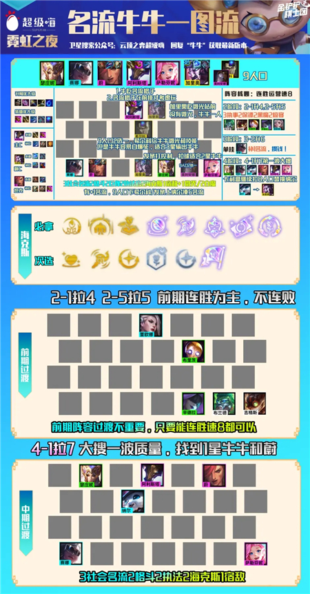 名流牛牛的核心是在于前期连胜速8凑出2星牛牛+加里奥,因此前期过渡阵容选择非常重要,像当前版本强势的海克斯枪手、保镖执事、赏金斗士过渡都是非常不错的选择。速8后找到2星牛头+1星加里奥即可完成锁血,后续可以拉9人口补充发条或者希尔科支撑质量。