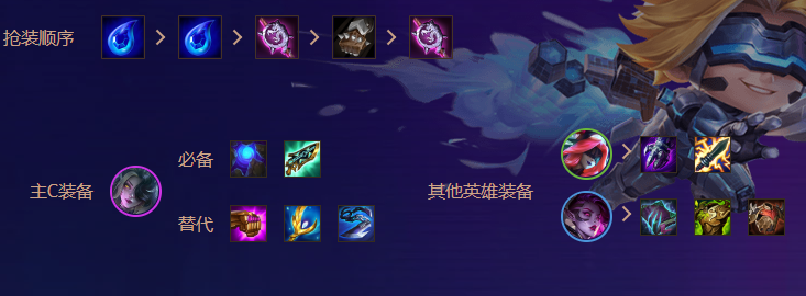 优先狐狸装备科技枪法爆或者炽天使巨杀,有输出有回复,前排莫甘娜狂徒鬼书反甲,有肉装给就可以,辛德拉保护边上给伏击带个电刀减魔抗。