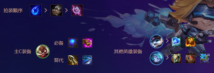 蓝buff很重要给飞机提供技能频率,如果法系装备过多可以合成离子来减对方前排抗性,肉装还是给熬夜波比带,多的防装如冰心日炎可以给到纳尔。