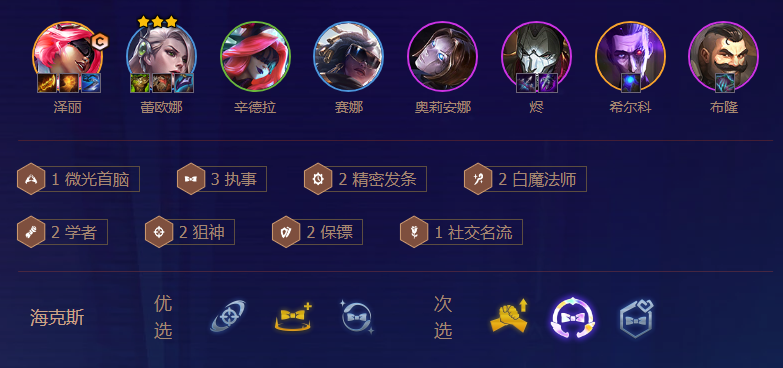 2、阵容羁绊:5发明家2精密发条2执法官2极客2学者1社交名流1宿敌1微光首脑1未来守护者