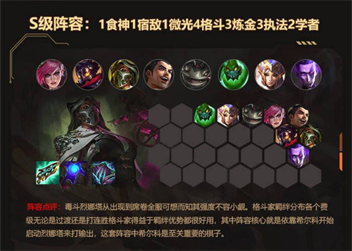 2、S级阵容:1食神1宿敌1微光4格斗3炼金3执法2学者