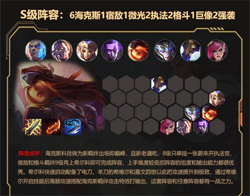 3、S级阵容:6海克斯1宿敌1微光2执法2格斗1巨像2强袭