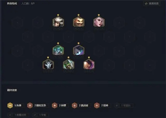 另外,这套阵容还可以组成5执事、2精密发条、2挑战者、2狙神以及2保镖。只需要将三个白魔法师替换成烬、泽丽以及布兰德就行。如果有泽丽所需装备的话,后面这套阵容输出更稳。