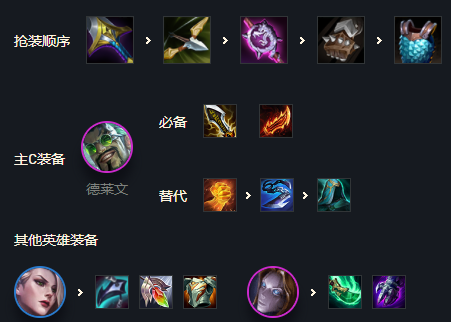 主C德莱文:装备给上无尽,羊刀,正义备选巨杀,水银。