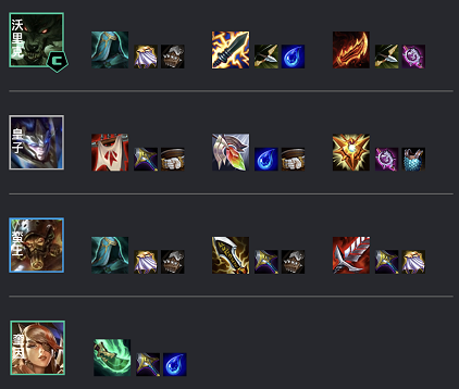 狼人水银必备,不然就被人晕来晕去,电刀羊刀和皇子技能绝配,实在没有就泰坦;蛮王出冰心有奇效,相当于冰心艾克,能够冲入人群最大化装备收益;有水滴装给皇子和奎因,方便提前启动