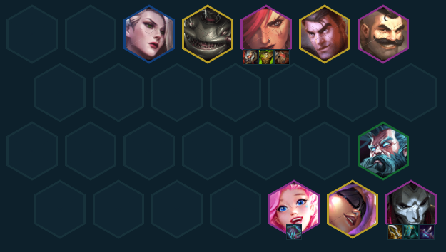 8人口的核心羁绊是4执法,没有杰斯和希尔科就用曙光+布隆代替。