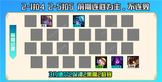 前期阵容:前期主要以3约德尔连胜运营为主,2-1拉4人口,2-5拉5人口,3约德尔只要前期能尽量快2星,阵容强度还是非常可观的,其次坦度