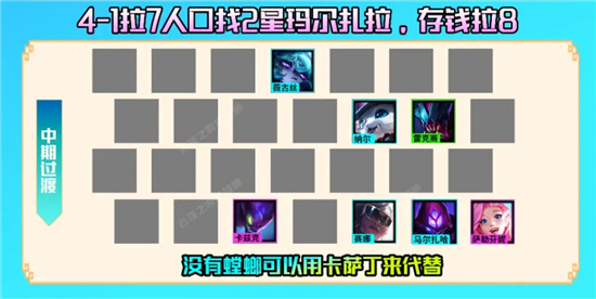 中期阵容:4-1先拉7人口,开3变异3名流2黑魔羁绊,小D30金币去找2星马尔扎哈,中期搭配蓝BUFF+鬼书在4阶段锁血能力极强。如果没有来螳螂可以用卡萨丁来代替,