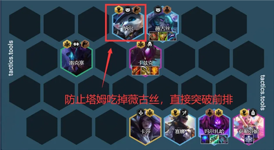 4.薇古丝是前排的关键,如果有格斗塔姆的情况下,需要将纳尔对位塔姆,防止薇古丝直接被吃掉。