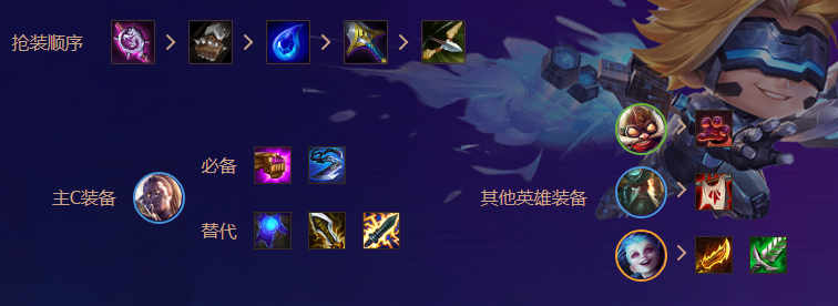 主C卢锡安:巨杀,法爆必备,最后一件可以给任意输出装。其余物理输出装给船长,法系输出装给飞机。金克斯最后捡装备即可。纯输出阵容,不依赖前排装。