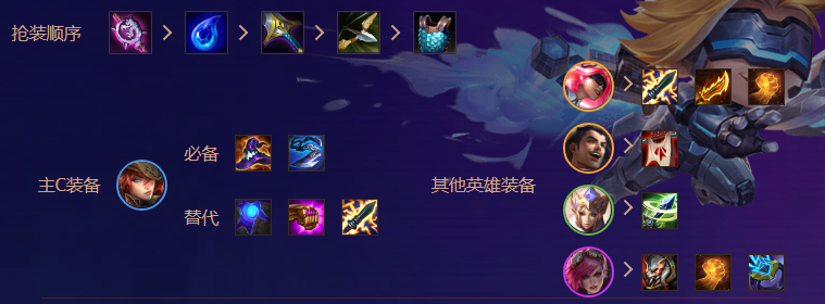前期有电刀之类的装备都可以给女枪打工会非常强势可以打连胜,主C女枪所有法装都能用,不用特别等装备,肉装给蔚,有条件的情况下可以给蔚做一个离子火花,给敌人减少魔抗增加女枪的伤害,物理装给杰斯,后期给泽丽捡垃圾装备即可