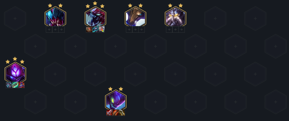 阵容组成:雷克赛(2)、科加斯(3)、阿利斯塔(4)、卡萨丁(1)、玛尔扎哈(3)、卡兹克(4)