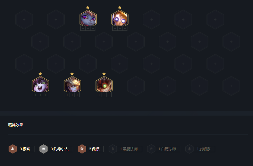 3阶段:3-2升6人口,这时候如果艾克可小D卡搜一张艾克,可4极客羁绊,3约德尔刃+4极客+2保镖在前中期稳血能力极强,只要大部分棋子2星就能稳定连胜。但一定记得装备要给不要等,4极客可让3枚棋子棋子的散件变成品。