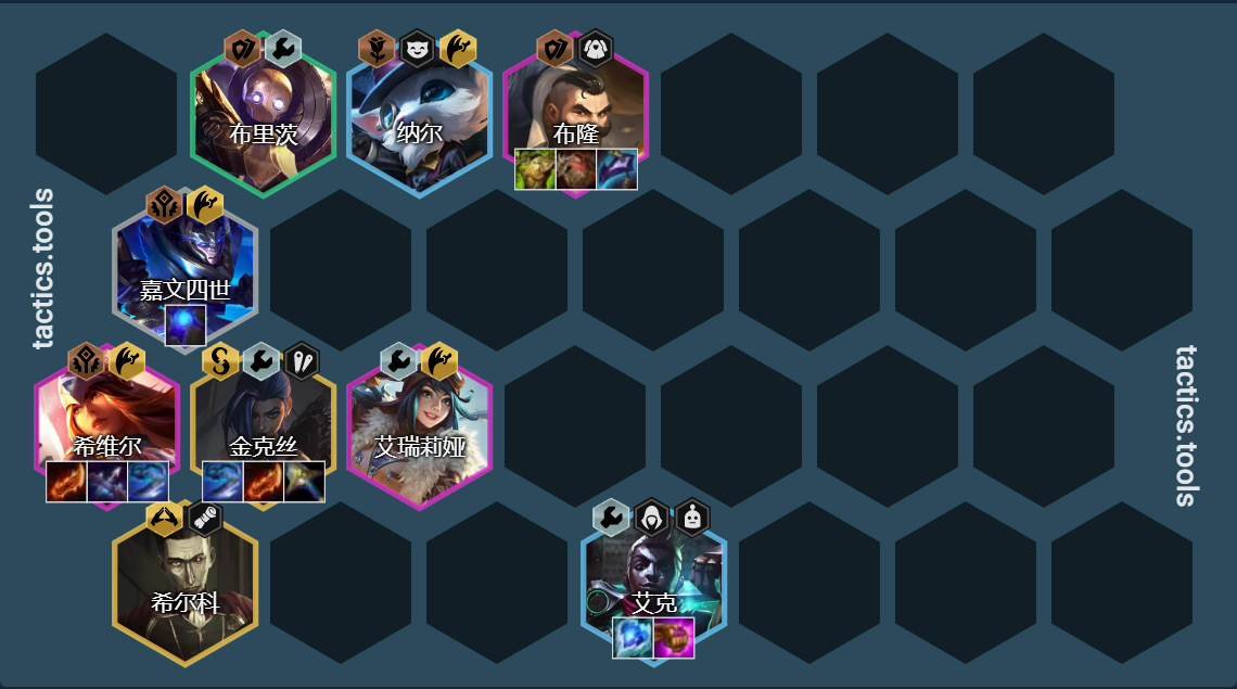 角色组成:希维尔、嘉文四世、布里茨、纳尔、艾克、布隆、艾瑞莉娅、金克丝、希尔科(9人口)