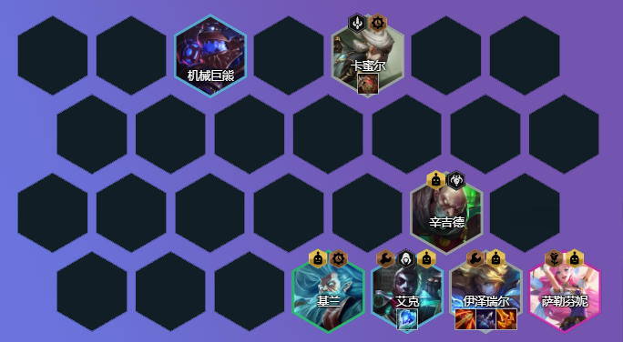 棋子组成:卡蜜尔、辛吉德、伊泽瑞尔、基兰、艾克、奥莉安娜、萨勒芬妮、烬