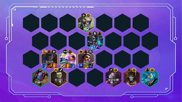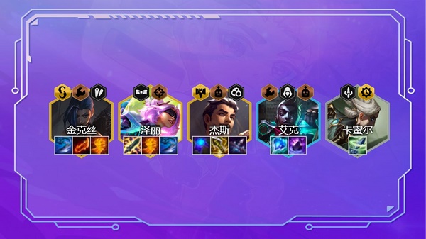 9.装备解析:这里需要强调一下,这里有3个5费卡,优先泽丽和杰斯当主C,金克丝随便拿点破烂即可。不要把泽丽的装备给金克丝。主C泽丽的装备是电刀和正义之拳必备,其他的装备随意搭配即可,最后一件装备可以搭配正义之拳、珠光护手、巨人捕手、帽子这些有什么做什么。主C杰斯搭配蓝霸服能够开局直接启动,给后排所有英雄加攻速,其次最后的轻语+无尽之刃是标配,能够保证杰斯稳定输出。副C金克丝的装备有什么做什么,没有单挂也无所谓。辅助艾克的装备是冰霜之心和传送门必备,传送门一定要做,这套阵容没有前排,没有传送门基本根本撑不住。