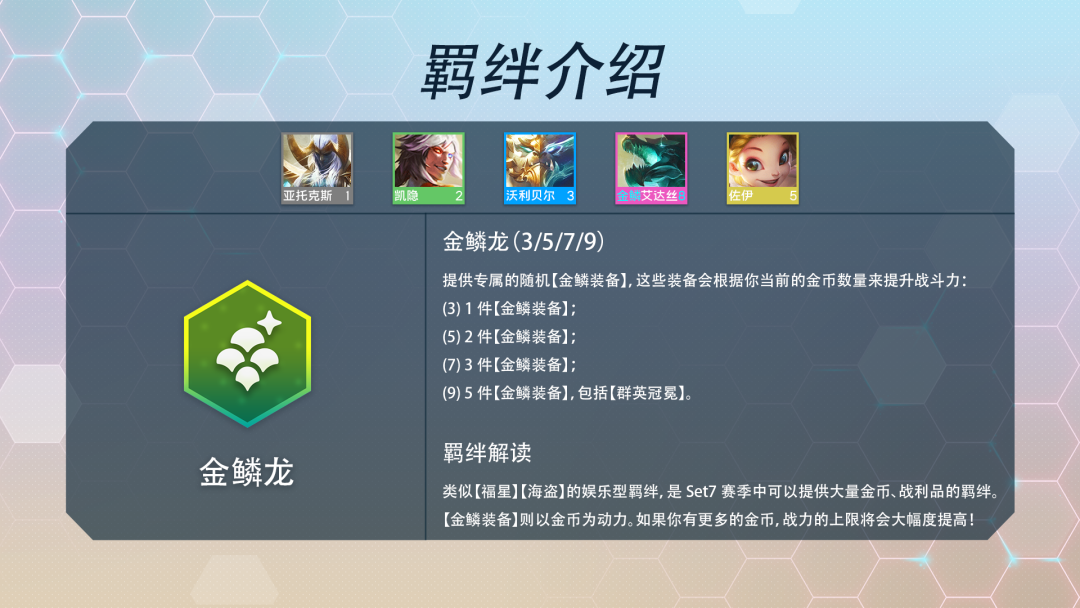 还有就是金鳞龙羁绊!当你激活金鳞龙羁绊时,就会马上获得金鳞装备,携带金鳞装备的英雄会获得属性加成,这个加成取决于你的金币数量,有点类似赏金猎人的重赏之下。金鳞装备除了能提供属性加成以外,还可以提供金币掉落,只要战斗力够强,你就能获得金币;只要有金币,就会有战斗力;这样便形成了永动!值得一提的是,如果你能开出9金鳞龙羁绊,那一定会获得【冠军之冕】,这将会是云顶之弈游戏里迄今为止最imba的装备,它可以使携带者造成基于当前金币9001倍的真实伤害!就算是给坦克携带,也可以瞬间清屏!