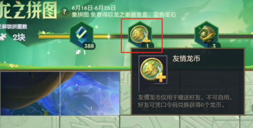 2、如图所示,解锁两块拼图即可获得友情龙币,友情龙币仅用于赠送好友,不可自用,好友可凭口令码兑换6个龙币