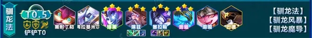 上图只是驯龙体系的一套阵容,驯龙体系后期变阵较多,大多数法系棋子均可充当主C。