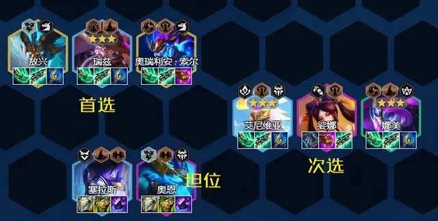 这套阵容主C主要可考虑6枚棋子 分别是,首选敖兴、索尔与瑞兹,次选艾尼维亚、娑娜与娜美。
