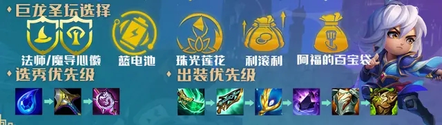 第一次选秀拿取宝剑最优,宝剑现在大热门,后期选秀很难拿到主要用来合成朔极之矛与科技刀,圣龙符文有法师/魔导心/徽、蓝电池、珠光莲花、阿福的百宝袋与利滚利都可考虑拿。