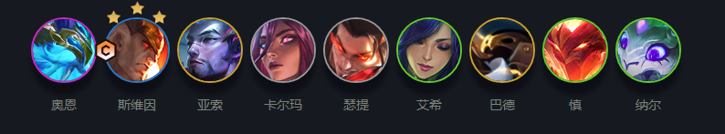 1、阵容组成:奥恩、斯维因、亚索、卡尔玛、瑟提、艾希、巴德、慎、纳尔