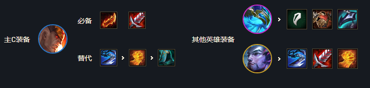 主C斯维因:羊刀、巨杀、饮血或水银也可以带正义副C亚索:一切物理攻击装都可,饮血、巨杀、正义之拳等辅助巴德:有回蓝装就给,没有就不给主坦:慎和纳尔,或纳尔和奥恩:一切肉装均可,反甲、龙牙、泰坦、石像鬼等。