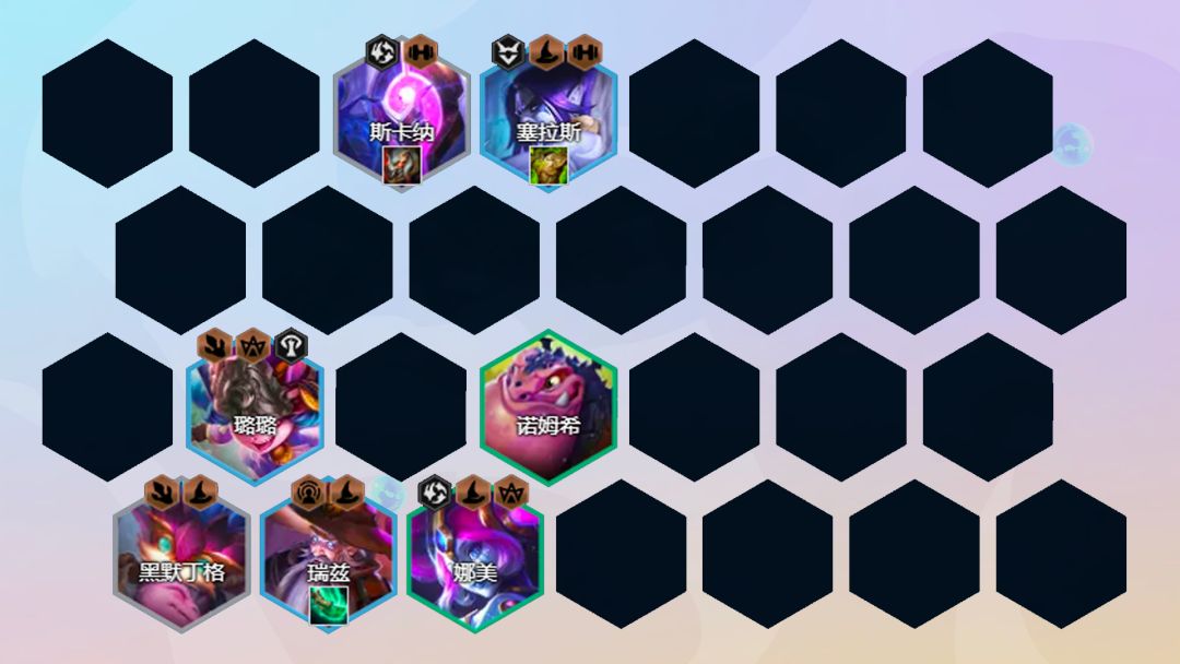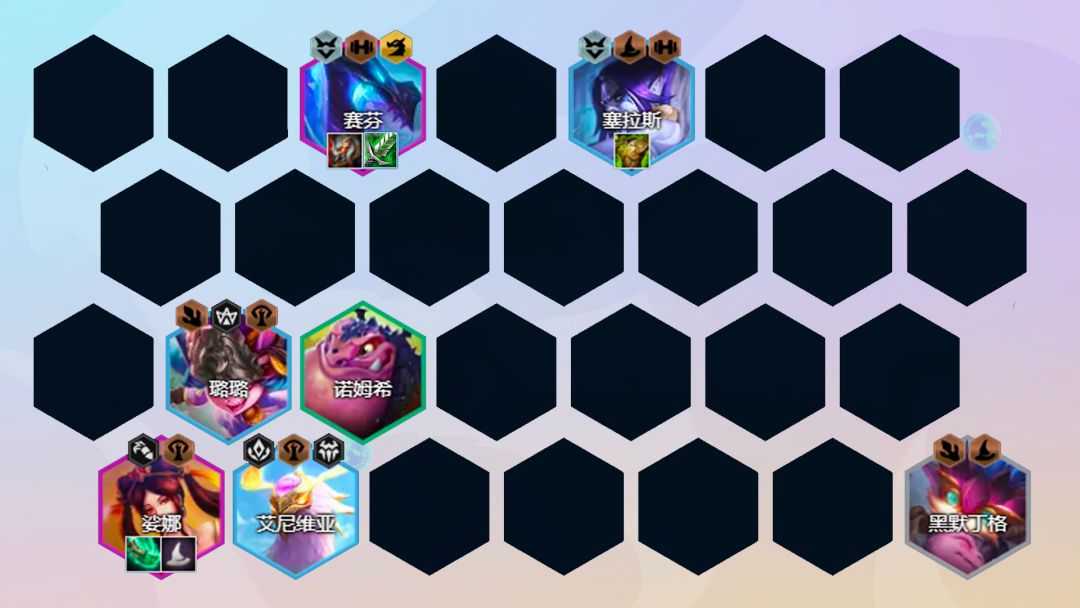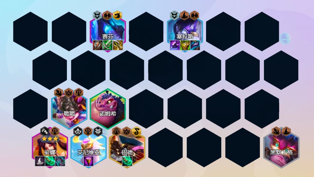 阵容组成:赛芬、塞拉斯、璐璐、娑娜(法师纹章)、艾尼维亚、巴德、黑默丁格