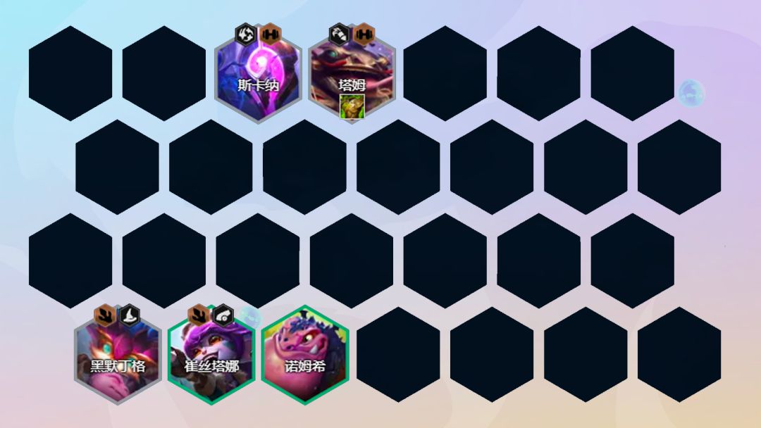 2阶段:2-1升4人口,2-5升5人口。前期斯卡纳、塔姆、黑默丁格、崔丝塔娜2斗士2驯龙打工过渡,二星塔姆和二星斯卡纳前期坦度很高,5人口补一个金克丝保证伤害,前期不搜卡,连胜养经济一直到2阶段野怪结束,观察是否有刺客,有可以把前排拉下来。