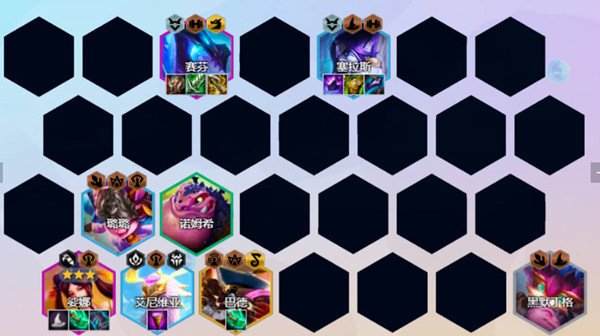1、阵容由,赛芬,塞拉斯,露露,琴女,冰鸟,巴德,大头组成的;