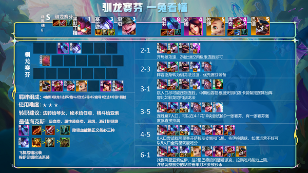2、2-3阵容逐渐转为驯龙法过渡,优先赛芬装备。