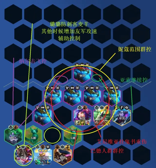 这套阵容属于双C体系石傲玉与艾尼维亚双输出点,一物理一法系,特别是艾尼维亚搭配5大 控制棋子,能让敌方吃满技能伤害,在鬼书下敌方高坦半血,其他前排棋子直接融化。而石傲玉与亚索就可轻松收割。