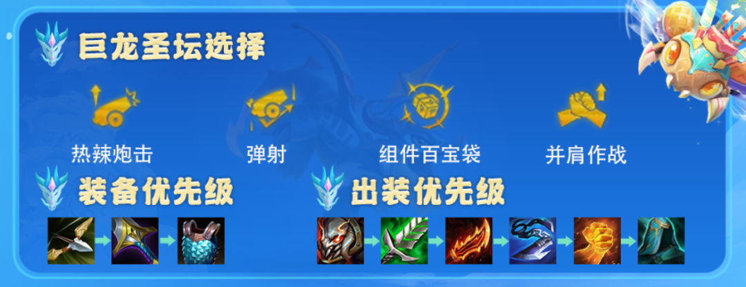 圣龙符文方面热辣炮击(增伤)、弹射(增伤)、并肩作战(增伤)、组件百宝袋这几个最优。