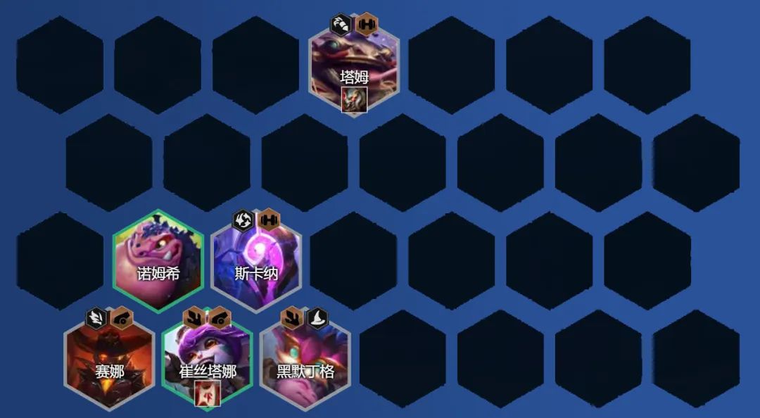 这套阵容是速八阵容,阵容中无太多热门棋子,同行少成型会比较容易,吃分会比较稳定,但阵容想吃鸡略难,吃鸡看装备的契合度与赛芬的对位(这赛季最难的两个棋子对位一个赛芬一个泰隆,赛芬是找2.5格子的敌方棋子,大家一定要注意)。