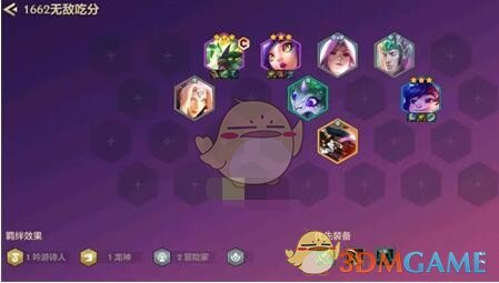 4.石傲玉妮蔻捆绑放置,哪里肉多放哪里,前排毁灭者。努努专走缝隙找后排,一口一个。巴德等有钱上九后再拿,有无巴德都能吃分。(运气差没有巴德,可以挂其他五费)这套按公式玩,只要前期升级升得快,同行都给你递到自闭。