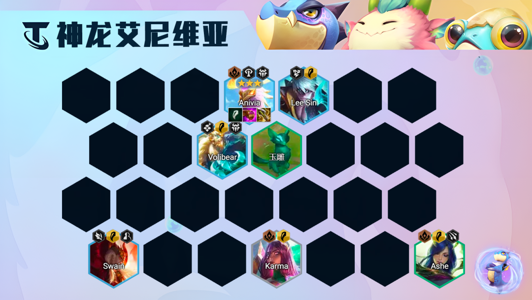 3阶段:3-2升6人口找到6神龙3玉龙羁绊,直接将艾尼维亚顶在前排。尽可能找到2星艾尼维亚,保证在前期的坦度,没有3半神献祭之前艾尼维亚的坦度会差一些。