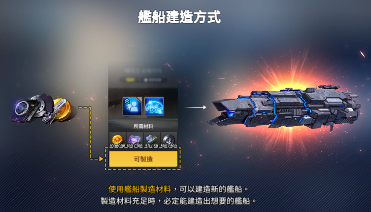 舰船建造:可透过战场或活动任务奖励所获得的战利品进行制造舰船。