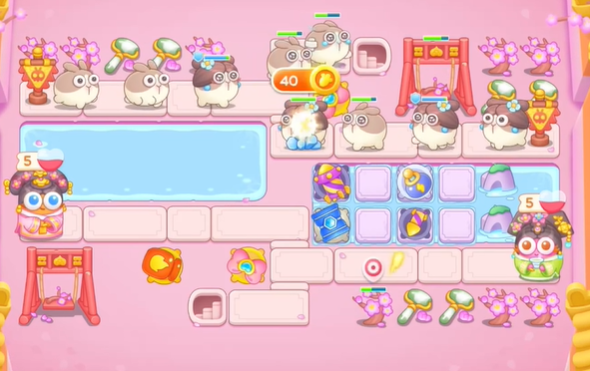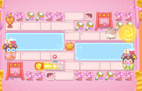 2、接着在地图的中央放置一个章鱼,和在右侧的池塘上建造火箭和冰桶。