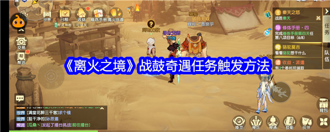 离火之境战鼓奇遇任务怎么触发?游戏中有很多奇遇任务,不同的奇遇大家做完可以获取奖励! 西大漠,点击阿布,触发骆驼。在调查旁边大鼓,触发战鼓。下面是小编给大家带来的《离火之境》战鼓奇遇任务触发方法,感兴趣的小伙伴们一起来看看吧。