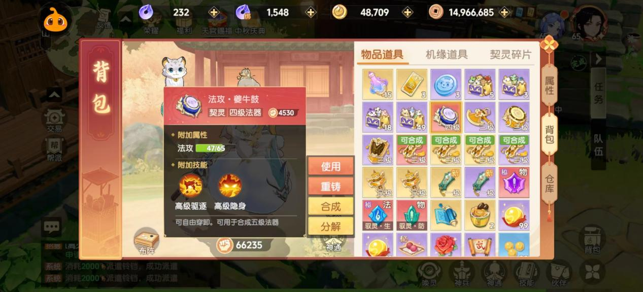 还是举老白重明鸟的例子,如果你想让重明鸟在PVP中后发收割,那么可以使用5魔加点的高级识破+高级隐身的法器搭配,这样你的重明鸟有了一套后发收割的技能搭配,在PVP时可以起到杀对面召唤骰子的作用,在PVP中又有了第三套打法!在爬塔时,你也会遇到重生怪物,使用高级追击+高级驱逐的法器,可以很容易地打通这些PVE关卡。所以第三个小技巧是功能法器要保留,增加自己契灵的打法多样性。