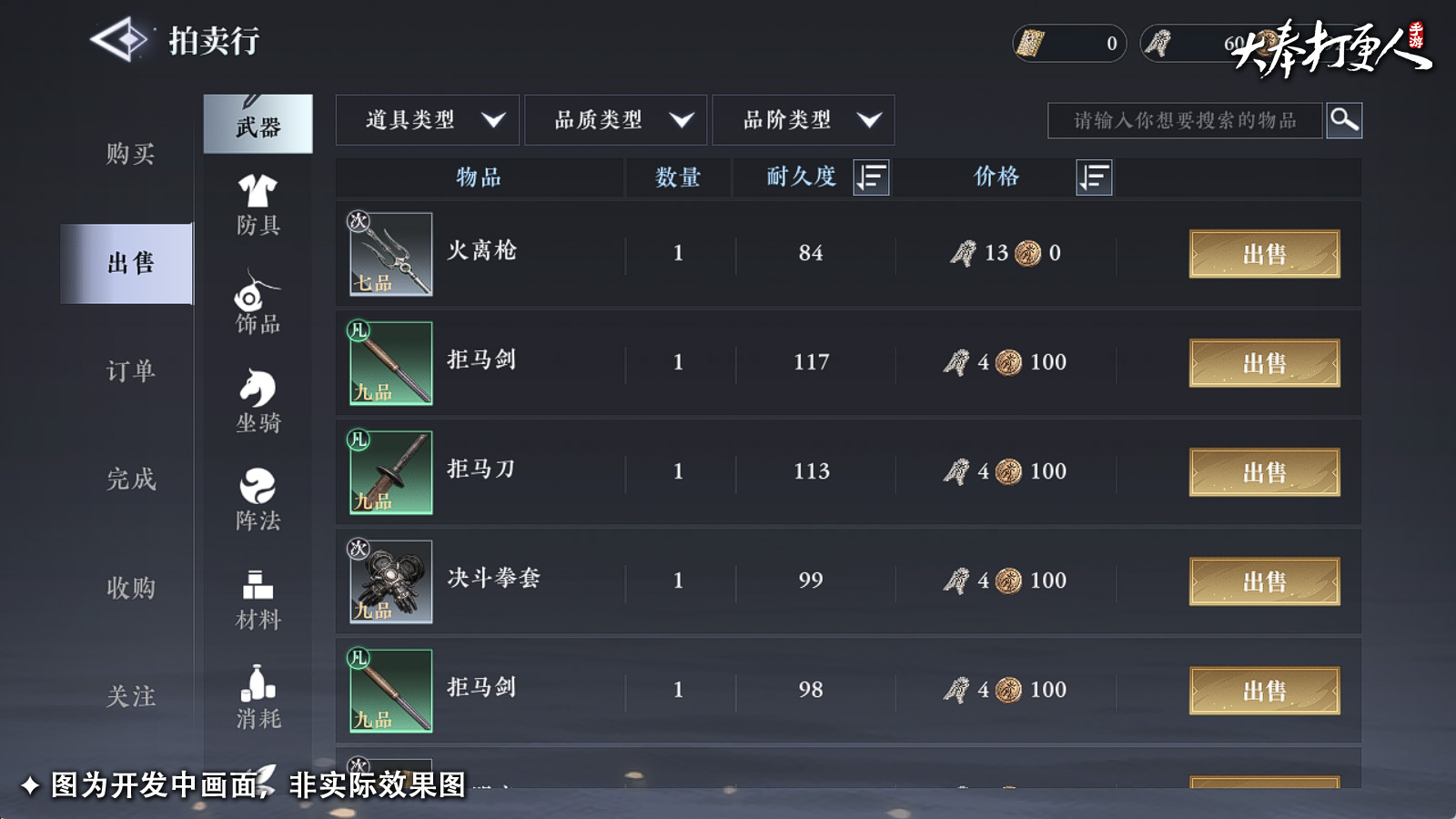 另外丹药、防具、饰品、坐骑均可上架,主打一个来者不拒~再也无需东市买骏马西市买鞍鞯,打开拍卖行一次性搞定!当然了,拍卖行会收取适量的手续费,毕竟花钱就是为了买方便嘛~ 总之,除了绑定己身的商品外,皆能上架拍卖行!