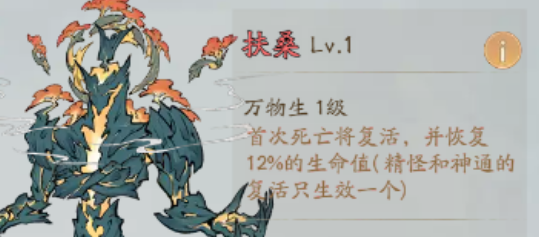 首次死亡将复活,并恢复12%的生命值(精怪和神通的复活只生效一个)。
