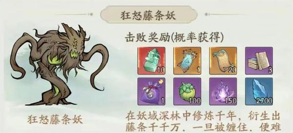 幽暗密林:探索体力消耗为1,可以探索妖兽、宝箱和神秘洞穴。进入下一层需要击败2个狂怒藤条妖或使用1个青冥石。