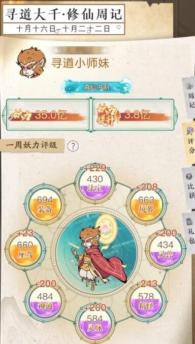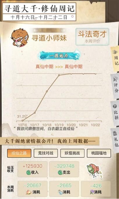 包括一周的妖力变化、资源消耗、竞技对战等等统计都会在这里展示。