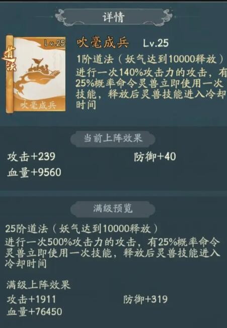 道法:吹毫(25%灵兽出手一次)跟应龙搭配就是增加应龙的出手的几率,道法印记推荐用强化灵兽。