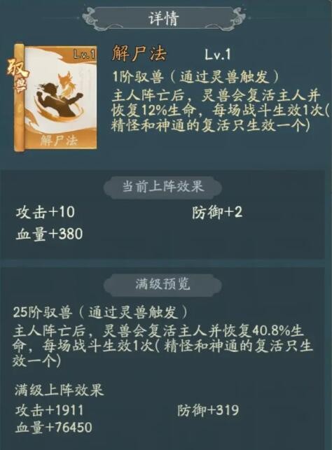驭兽:尸解法。复活保命,死亡也可以触发勾陈效果,可以打死后起来闪避后又快满血了。