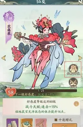 3、好感度与属性加成:提升仙友的好感度可以增加连击加成百分比以及其他属性加成。