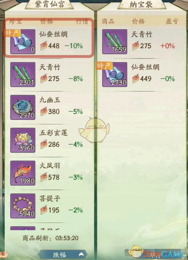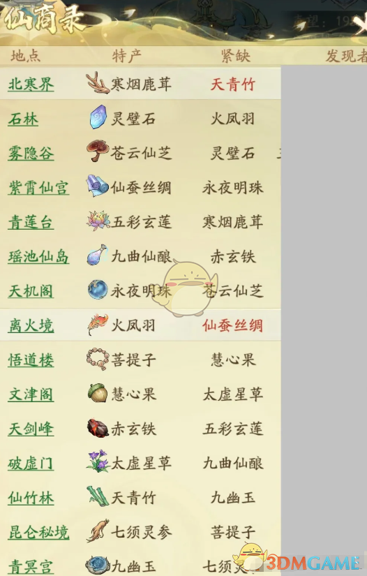 4、买完商品,在左下角点击仙商录,就可以看到你包里的商品在哪里卖的贵,仙蚕丝绸在离火境境卖的贵。