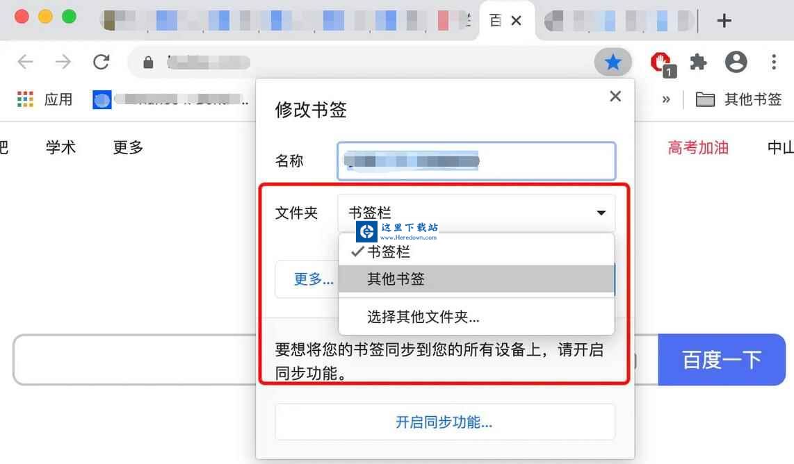 接着,点击文件夹,可以选择将网址保存在书签栏或者其他书签栏