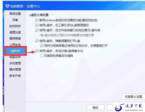 3、最后在打开的新界面中点击左侧的U盘防护,然后找到右侧“使用U盘时,自动扫描U盘病毒木马”将其勾选上再点击保存确定就可以了,如下图所示。